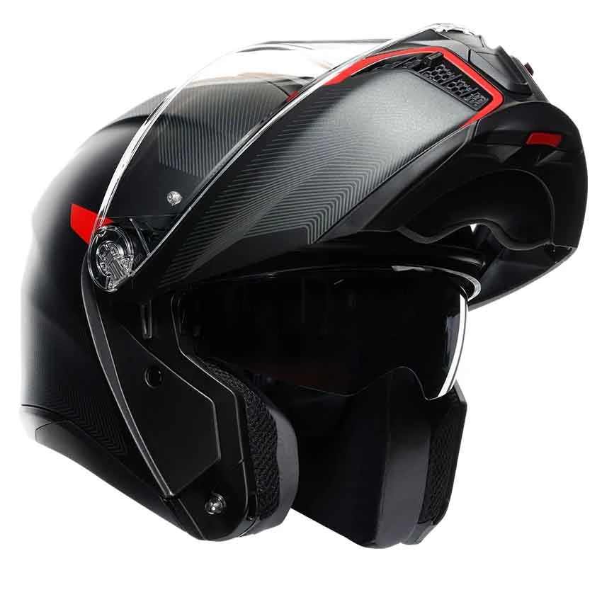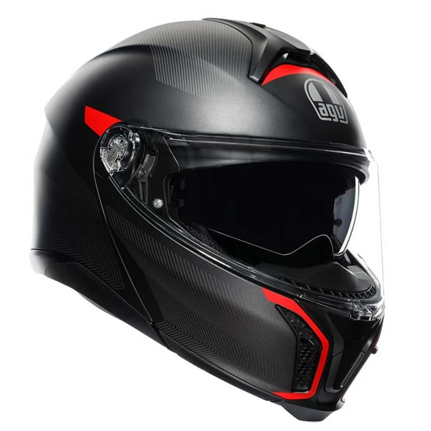 The anti-scratch clear visor offers a wide field of view and is supplied with a Pinlock Maxvision lens to prevent fogging of the visor. The visor mechanism offers the possibility to lock the visor in 4 different positions. Furthermore, the Tourmodular is equipped with an integrated sun visor that is easy to operate with a slider on the side of the helmet.