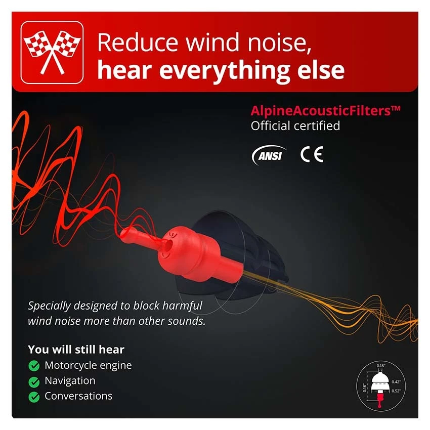 The MotoSafe earplugs attenuate harmful sounds without feeling isolated from the environment. The surrounding traffic, navigation system, intercom and the engine itself can still be heard clearly thanks to the innovative AlpineAcousticFilters™. This special MotoGP version of the race earplugs keeps your hearing safe during your ride.