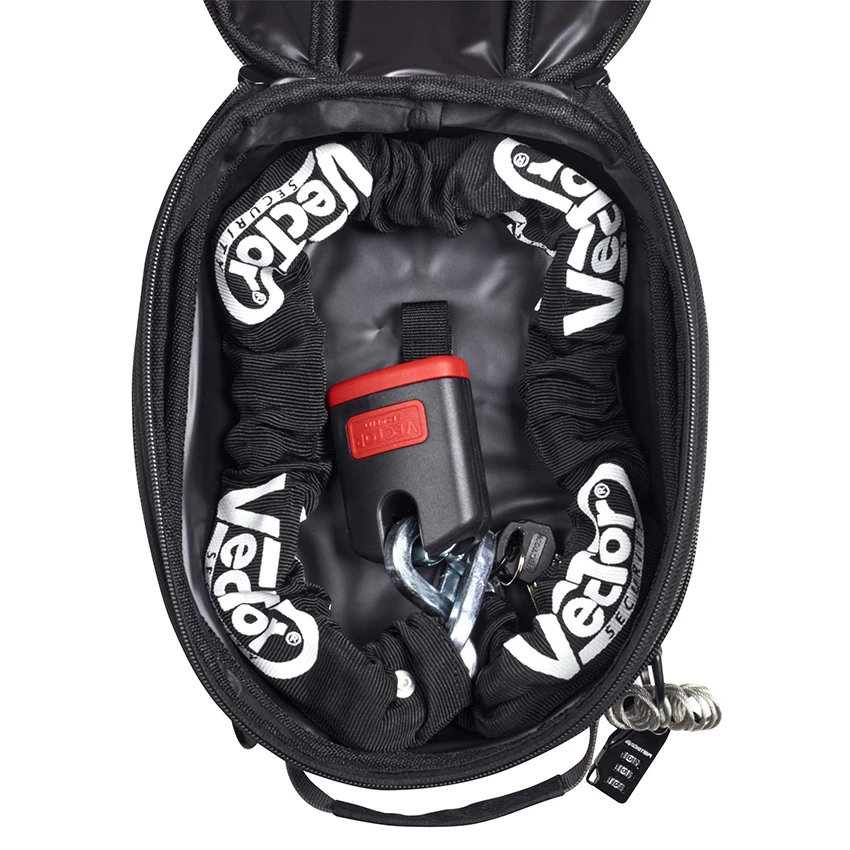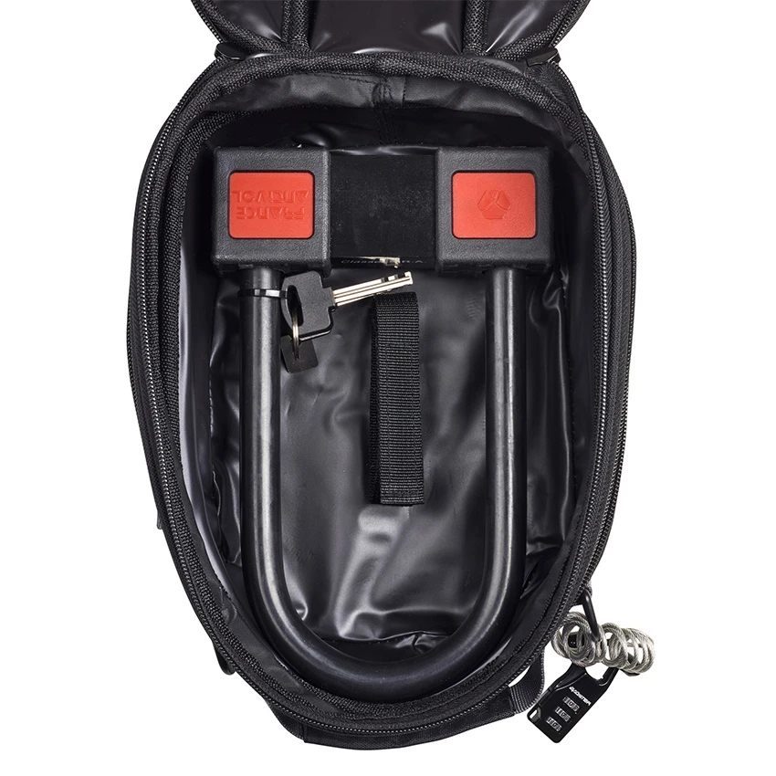 LOCKER is a saddlebag dedicated to storing your disc unit, chains or U-lock and fastens onto your saddle or backplate. Its thermoformed bottom will protect your bike. The interior of the bag is entirely washable should you wish to transport your rain gear. Maximum weight: 5 kg. Reminder: The extra straps must be well-fastened using the Velcro strips (close-up) and never hang above your back wheel.