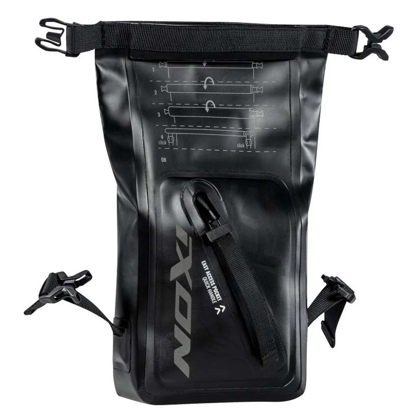 The R-Buddy bag has a capacity of 1.5 litres. It includes a main compartment that’s 100% waterproof thanks to a rollover fastening system. The belt and leg straps can be adjusted for an optimum fit. You can attach the bag to IXON backpacks using the straps. Dimensions circa 19 x 16 x 5,5 cm.