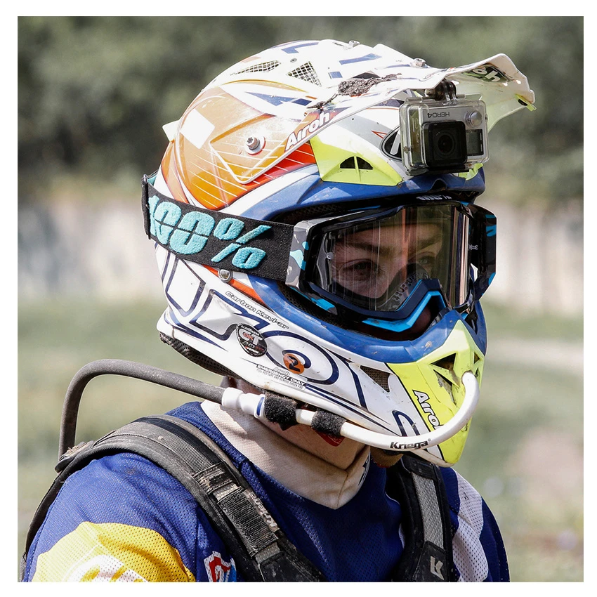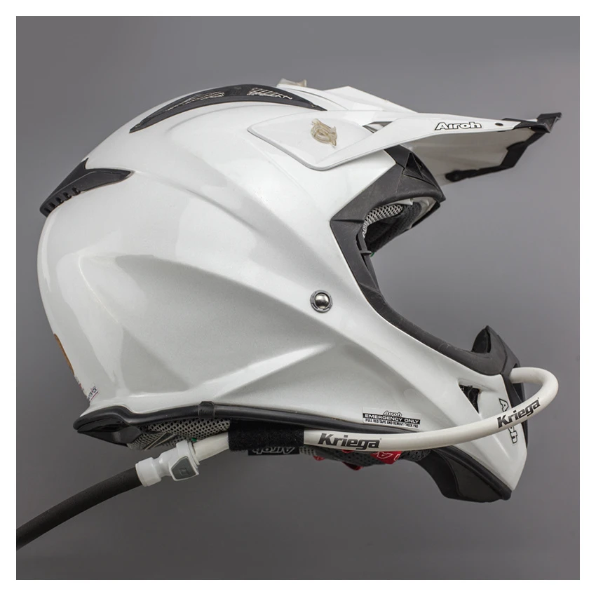 A flexible white silicone tube fits along the base of the helmet with a Velcro® tab which fixes to the inside of the helmet under the cheek pads. The tube pushes through a hole in the front air vent so that the soft bite valve is positioned near the riders lips. A quick-release dry-break valve makes it easy to remove your helmet while still wearing the backpack. A big bore insulated tube connects to a Kriega 3 litre Hydrapak® reservoir with the push of a button (Hydrapak® sold separately).