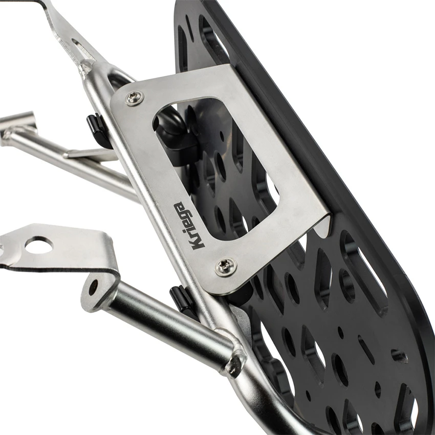 BMW Motorrad GS ADVENTURE pannier frames are designed to mount aluminium cases and do not have a standard flat profile on the exhaust side. This special edition OS-PLATFORM includes a stainless steel adaptor to flatten the profile and provide a strong mounting location for the OS-PLATFORM, which then gives you the option to mount Kriega ‘Soft Luggage’.