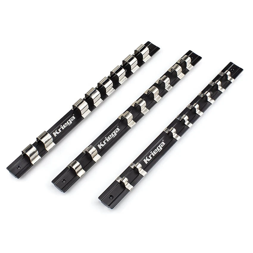 Add additional socket rails to your Roland Sands Design X Kriega Roam Tool Roll. Simply mount on the Tool Roll with screws included. 6061-T6 alloy rail with 8 socket clips.