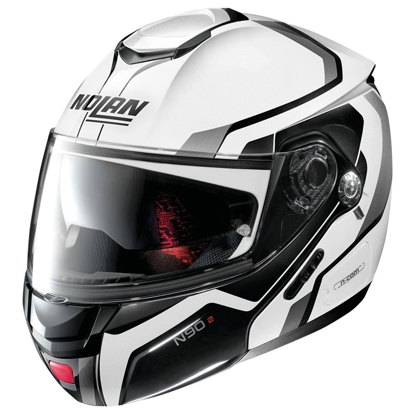 The Nolan N90-2 Meridianus N-Com is characterised by a sport-inspired design and its generous technical features. Double P/J homologation, VPS sunscreen, an exclusive double-action chin guard opening mechanism, Microlock2 double-lever retention system with micrometric adjustment and set up for the N-Com communication system make the N90-2 an interesting flip-up helmet in both the scooter and motorbike sectors.