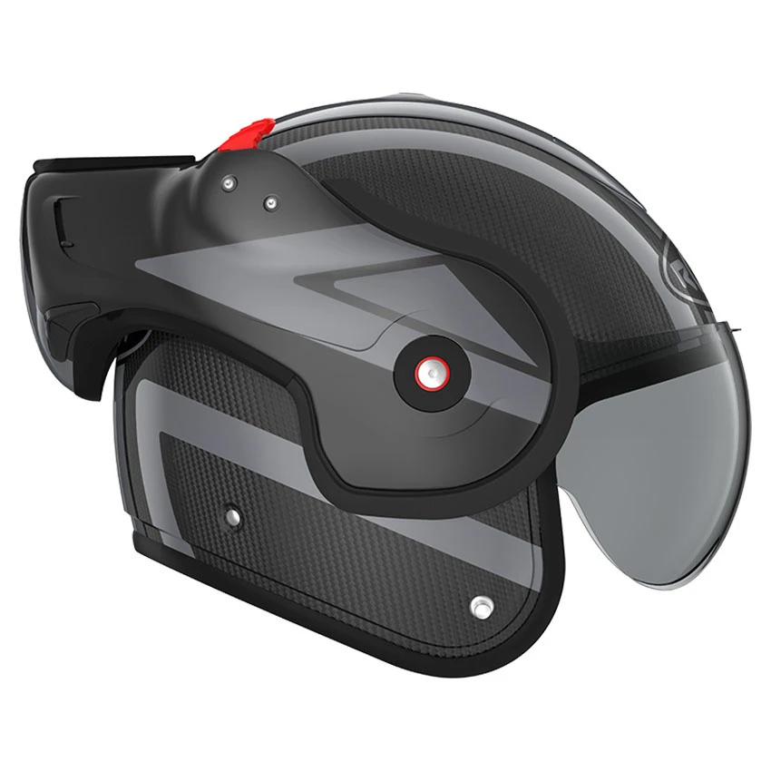 The helmet retains its double inspection of jet and system helmet but also gets the ‘silent lining’ as we know it from the Roof Desmo. In addition, you lock and unlock the chin with one hand!
