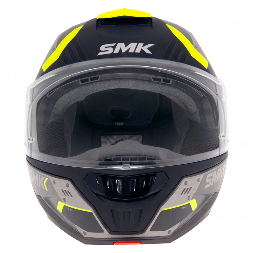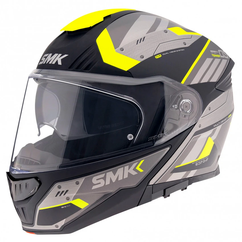 The SMK Gullwing Tekker motorcycle helmet is a modular helmet and is double approved P/J ensuring safety and maximum comfort. A smartly designed ventilation system with vents on the top and chin areas along with air exhausts at the back to offer full comfort even in extreme weather conditions, both on long trips and in everyday commuting. The extra-wide visor provides an excellent view of the road. It comes with a range of exciting features like an internal retractable Sun Visor, Pinlock prepared clear visor.